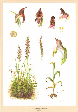 If Anacamptis coriophora (the Bug Orchid) is both robust and malodorous, Anacamptis coriophora subsp. fragrans (the Fragrant Orchid) is noticeably more delicate and has a suave yet discreet scent. The flowers are small and close to the spike, attractively coloured and speckled. The plant most often reaches about twenty centimetres in height.